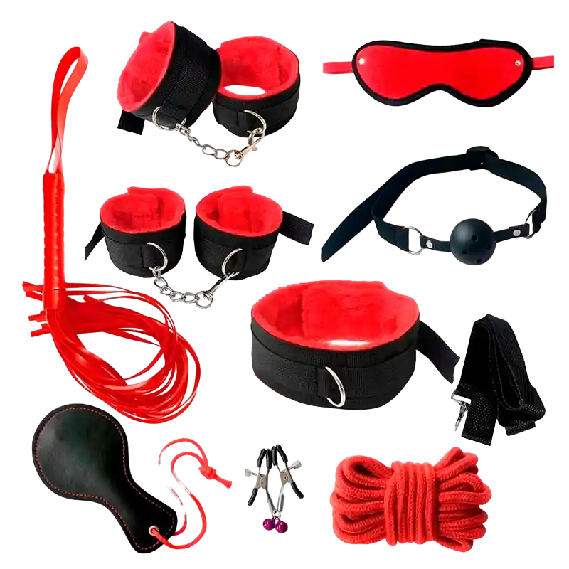 Contiene: Esposas de mano - Esposas de pie - Collar - Correa para collar - Pezoneras Cascabel - Spank Cuerda Fetish - Tapa Ojos - Látigo - Ball Gag Te ayudara a desbloquear posturas más emocionantes para que vivan una experiencia diferente y maravillosa, diseñado para que tu amante no se escape, se vean restringidos y mucho mas sexy. MATERIAL: Correas de nailon y clips de acero inoxidable