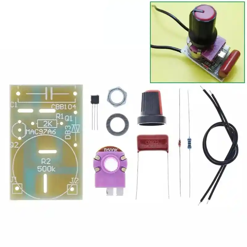 Un Dimmer AC (a diferencia de un Relay) permite el control regulado de voltaje AC, permitiendo obtener voltajes intermedios entre 0 y 220V AC y de esa forma variar la intensidad de brillo en bombillas incandescentes, la velocidad en motores ac como ventiladores, la potencia de un calentador resistivo y más. Tamaño de PCB: 2 * 3.3 CM Potencia nominal: P = UI; 100w = 220V * 0.45A Modelo: módulo de atenuación de 100w; Potencia nominal: 100 w; Adecuado para motores de AC de menos de 100 W, control de luz de atenuación, etc. (las lámparas de ahorro de energía no son compatibles); Listado: 1X PCB pieza 1X WH149-500k con potenciómetro de conmutación 1X tapa del potenciómetro 1X Diodo bidireccional DB3 1X Resistencia 2k 0.25W 1X MAC97A6 1X 104 capacitancia CBB de 630 V LA COMPRA INCLUYE: 1x KIT REGULADOR DIMMER AC 100W PARA ENSAMBLAR