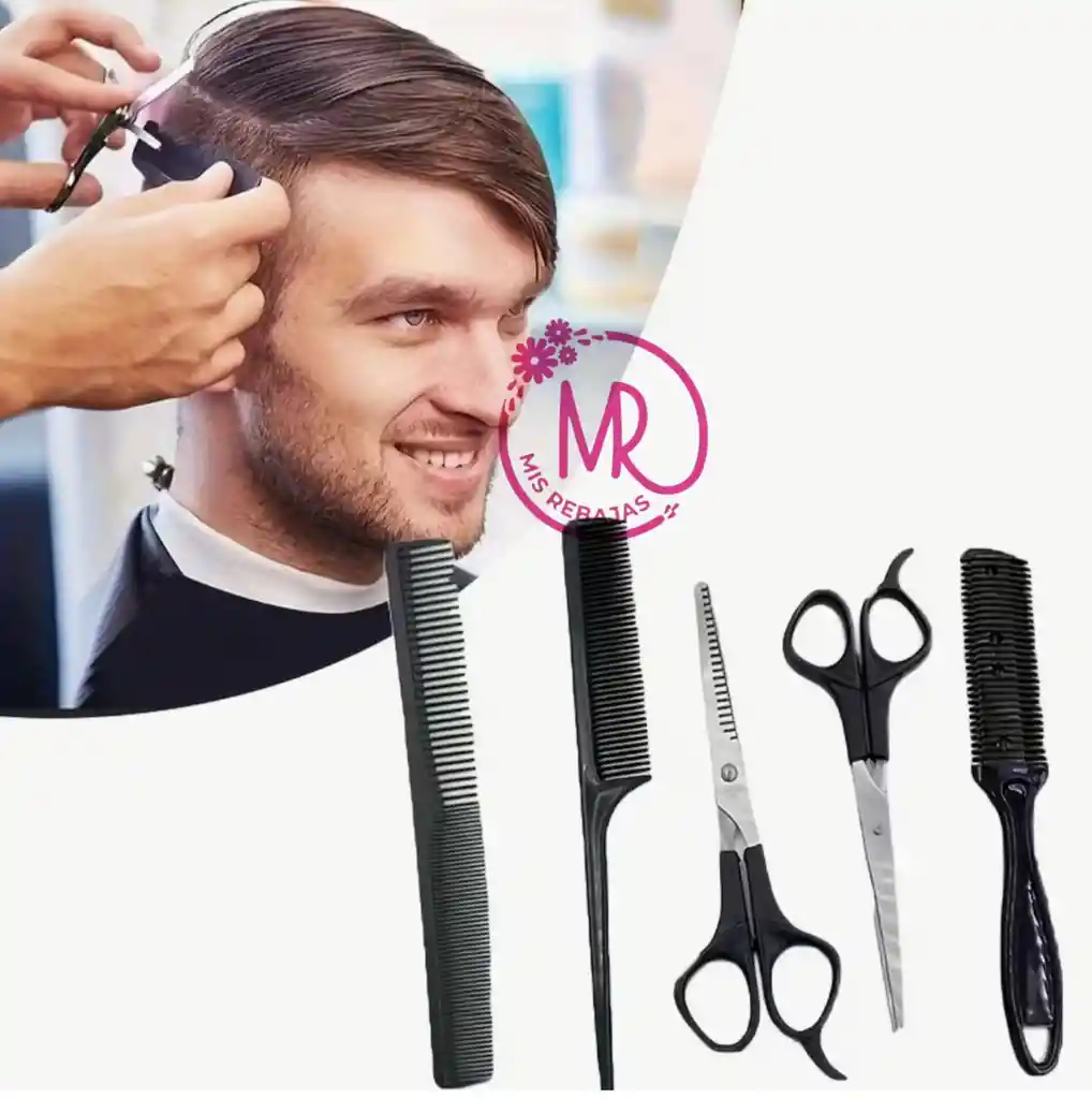 Incluye: tijera para corte de cabello+ tijeras de pulir que se usan para emparejar, quitar o dar volumen al cabello+ peinilla de corte+ peinilla+ peinilla de cabo.
