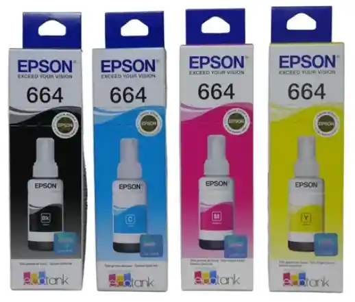 Nuestro kit consta de 4 tintas así: 664/T664120-AL Negra - Contenido 70ML = 4.500 Páginas Aproximadamente 664/T664220-AL Cian Contenido. 70ML = 4.500 Páginas Aproximadamente 664/T664320-AL Amarillo Contenido. 70ML = 4.500 Páginas Aproximadamente 664/T664420-AL Magenta Contenido. 70ML = 4.500 Páginas Aproximadamente Tipo: Tinta Referencia: Epson 664 Color: Negro Magenta Amarillo y Cian Compatible con Epson: • L120 • L200 • L210 • L220 • L300 • L310 • L350 • L355 • L365 • L375 • L380 • L395