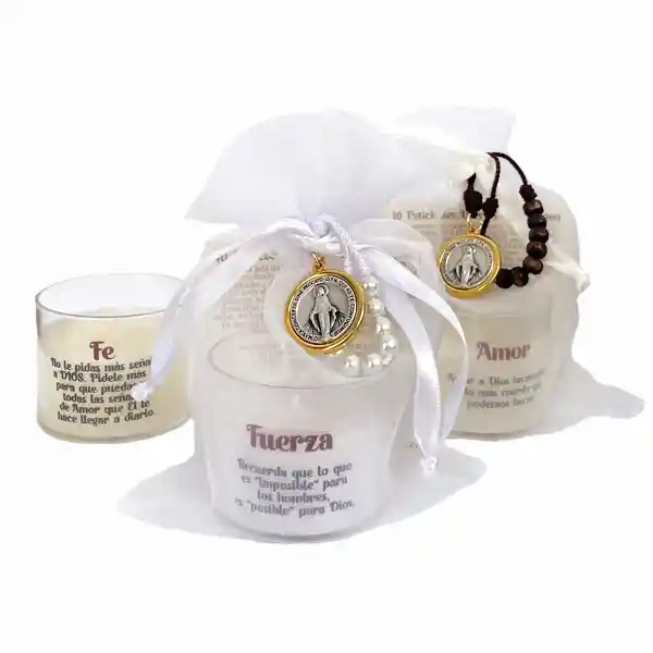 El Kit Vela Peticiones a la Virgen, consta de una vela de aroma con un mensaje de; FE, Amor o Fuerza; relacionados con Dios. Adicional trae un denario con la medalla de la Virgen de la Medalla Milagrosa (Pepas en; Madera o Perla) y una Oración guía. Cada pepita del denario es una petición…