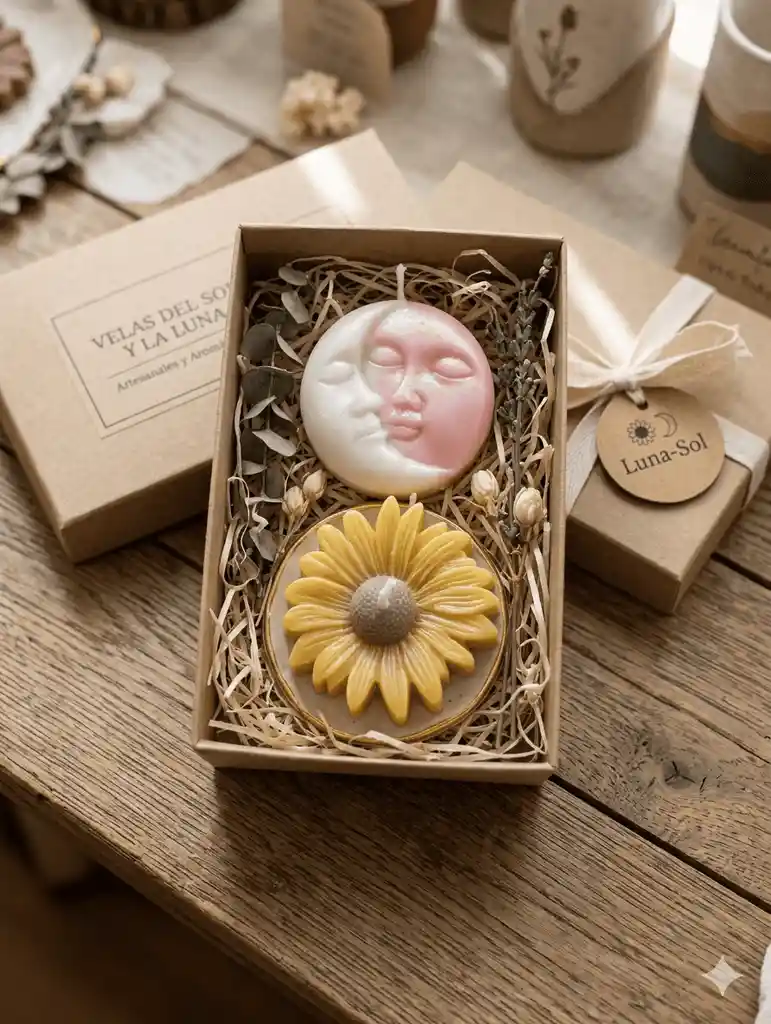 Cajita velas aromáticas 1 girasol y un sol y luna, Ideal para ambientar tu hogar y aromatizar