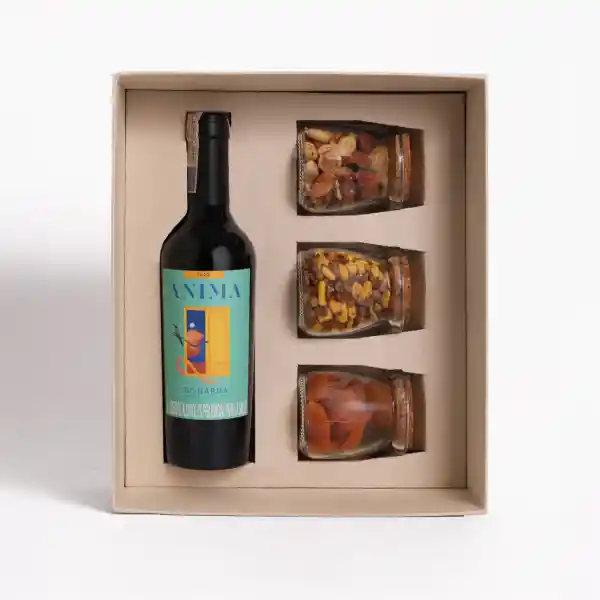 Incluye media botella de vino tinto anima, albaricoques, trail mix nutritivo y trail mix clasico