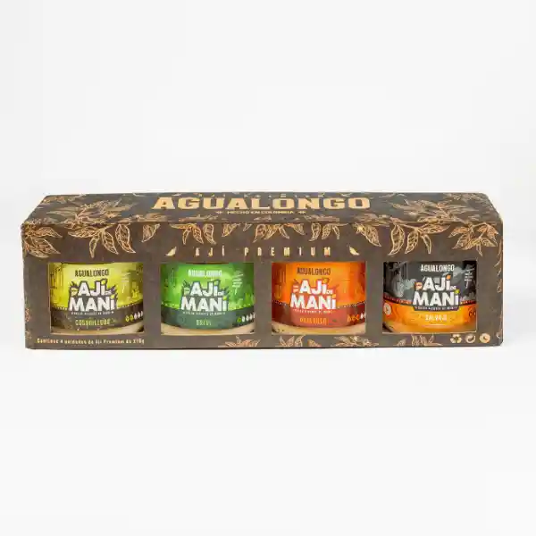 Combina 4 de nuestras mejores salsas picantes como desees, en un empaque elaborado pensando en su origen vegetal, Ideal para acompañar: carnes, pescado, empanadas, quesos, snacks Escríbenos las 4 opciones de Ají: Ají de Maní: picante bajo, medio, medio-alto, picante alto Ají de Frutas: tomate de árbol, mango, uvillas/uchuvas, maracuyá o papayuela. Presentación: 210g Envases de vidrio Caja de regalo Apto para personas veganas Registro INVIMA: RSA-0031748-2024 y RSA-0031780-2024 Duración 360 días a temperatura ambiente Una vez abierto se debe refrigerar