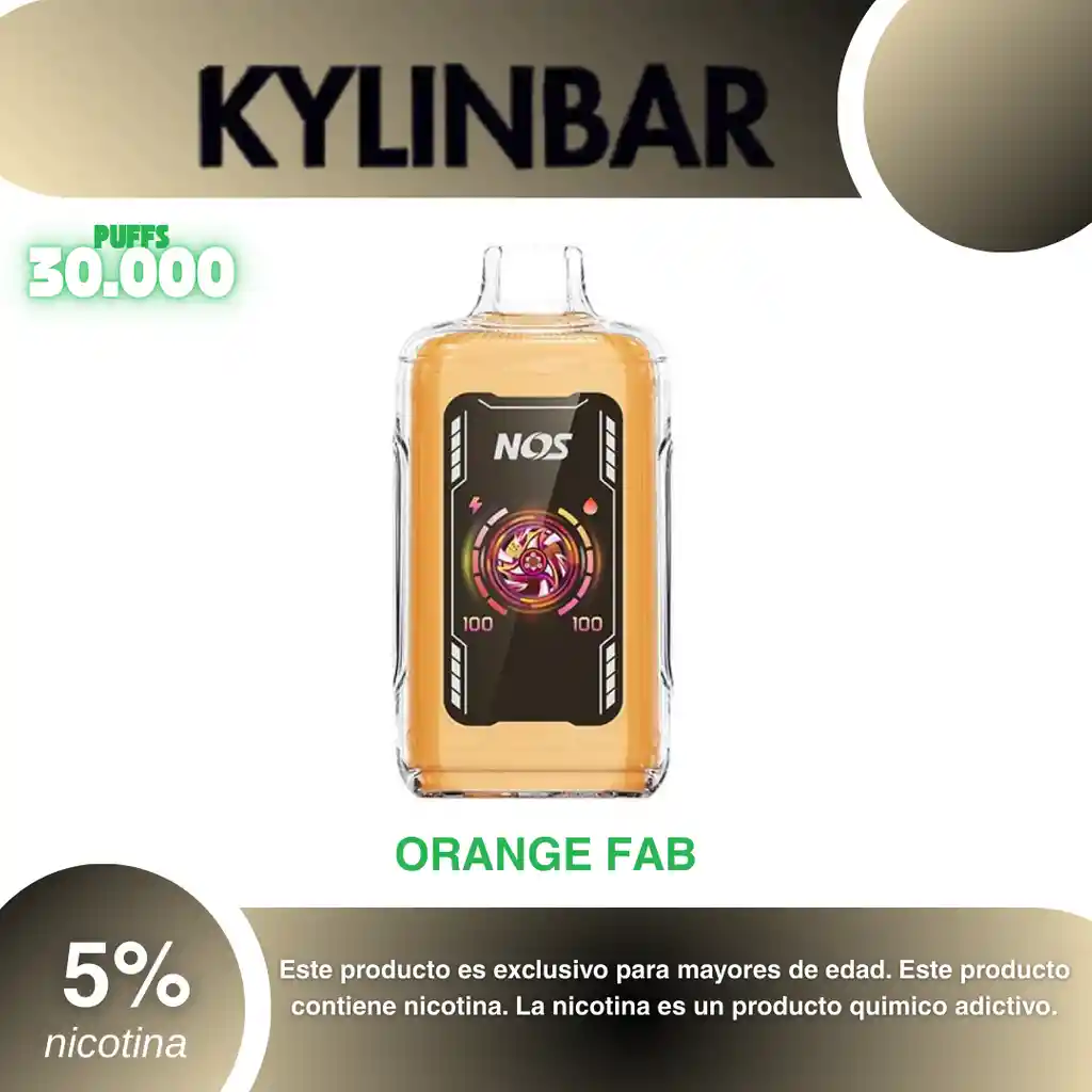 Kylinbar 30.000 Puffs, Sabor Naranja 5% PROHIBIDA LA VENTA A MENORES DE EDAD. ADVERTENCIA: ESTE PRODUCTO CONTIENE NICOTINA, LA NICOTINA ES UNA SUSTANCIA QUIMICA ADICTIVA Y NOCIVA PARA LA SALUD. Los líquidos para vapeo contienen: propilenglicol USP, glicerina USP, sabor artificial y nicotina. Este producto puede contener nicotina, una sustancia altamente adictiva que puede generar dependencia, posibles afectaciones arteriales, cardiacas, pulmonares y otras aun no identificadas. No se recomienda su uso a mujeres en embarazo, puede generar lesiones al feto. Mantener alejado de niños y mascotas. No ingerir, puede generar irritación y/o intoxicación. Por favor antes de consumir consulte a su médico posibles afectaciones o sensibilidad a alguno de sus componentes. Los componentes de este producto pueden aumentar la sensación de ansiedad En caso de notar alguna reacción adversa por favor suspenda su uso de manera inmediata. Siga las instrucciones en el envase. No alterar sus componentes. Adquiera sus productos en sitios de confianza No use productos piratas, alterados, o en los cuales no pueda comprobar su buena procedencia, Verifique la reputación del fabricante y distribuidor antes de adquirir cualquier producto Si no es usuario fumador o vapeador no se recomienda su uso bajo ninguna circunstancia Al usar este producto usted es consciente que este producto puede generar afectaciones a su salud, incluyendo aquellas que a la fecha de la compra no se han identificado y que pueden aparecer a largo plazo