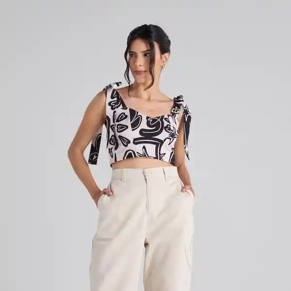 Top estampado en tono arena, con escote semirecto y tirantes ajustables mediante lazos en los hombros. Espalda tipo “nido de abeja”. Composición: 88.7% Poliéster, 11.2% Elastómero. La modelo mide 1.60 m y usa talla S. Cuidados especiales: Leer la etiqueta de cuidados antes de lavar.