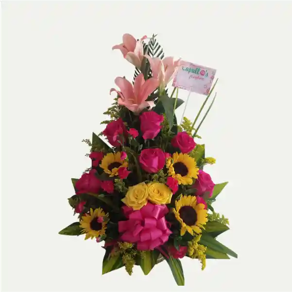 3 lirios, 6 rosas fucsias, 2 rosas amarillas, 4 girasoles, solidago, variedad de follaje, base de mimbre y lazo fucsia. Categoría: familia y amistad La primavera es, quizás, la más linda de las estaciones. En ella renace la vida, crecen las flores, cantan las aves y se aleja el frío Hay lugares en nuestra bella colombia en donde la primavera es eterna. Ahí nacen las bellas flores de este