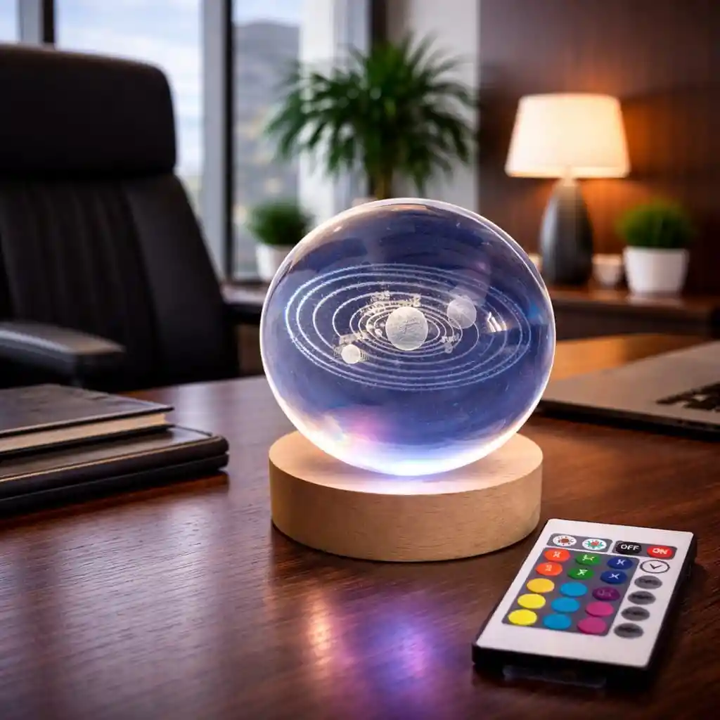 La lámpara bola de cristal 3D con diseño del sistema solar es una pieza decorativa única que ilumina cualquier espacio con un efecto visual elegante y relajante. El grabado láser dentro del cristal muestra los planetas y sus órbitas, creando un efecto tridimensional muy llamativo. Incluye control remoto para cambiar fácilmente los colores y efectos de iluminación, permitiendo crear distintos ambientes según el momento. Es ideal para decoración de habitaciones, escritorios, cuartos infantiles, salas o espacios de estudio. También es una excelente opción como regalo original y decorativo. Funciona mediante conexión USB, por lo que puede usarse con cargadores, computadores o power banks. Características * Bola de cristal con grabado 3D del sistema solar * Iluminación LED multicolor * Control remoto incluido * Base decorativa estilo madera * Alimentación por USB * Ideal para decoración de habitaciones y escritorios Contenido * 1 Lámpara bola cristal sistema solar 3D * 1 Base LED tipo madera * 1 Control remoto * 1 Cable USB