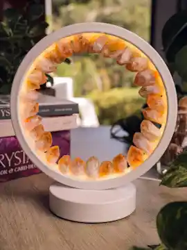 Lampara led redonda con cuarzos naturales, perfecta para decorar y armonizar espacios. Cuenta con luz graduable para crear el ambiente que prefieras. La fotografía es de referencia, el color y la forma de los cuarzos puede variar por el origen natural de los cuarzos. 20cm de alto x 17cm de ancho aproximadamente
