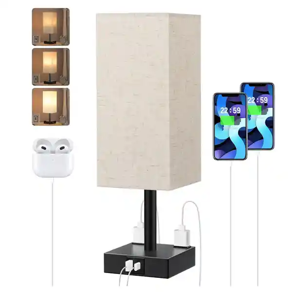 Lampara de mesa para dormitorio con USB, lampara de noche con puertos de carga USB C+A, luz LED ajustable de 3 colores para decoracion del hogar, mesita de noche, dormitorio, oficina, bombilla incluida y pantalla de lampara de tela -Lamparas de mesa regulables de 0% a 100%: las lamparas de mesa de noche estan disenadas con un interruptor giratorio suave, simplemente gira el interruptor para elegir el brillo del 0 % al 100 % para todas las ocasiones, para crear diferentes estados de animo a tu voluntad. Luz baja: como una practica lampara de mesita de noche para uso a medianoche, no te preocupes por el interruptor a prueba de problemas; luz media: para uso normal o iluminacion decorativa; luz alta, lo suficientemente brillante para leer al lado o usar como una lampara de escritorio USB para estudiar o trabajar. -Puertos de carga USB + tipo C y salida de CA: el juego de 2 lamparas de dormitorio para mesita de noche estan equipadas con puerto USB, tipo C y una salida de CA de 2 clavijas, que puede mantener de forma estable una salida de 5 V 2.1 A, hace que tu telefono, tableta, humidificador, Kindle, auriculares y otros dispositivos electronicos esten cargados si el juego de 2 lamparas de mesita de noche estan encendidas o apagadas -Incluye 2 bombillas LED: el juego de 2 lamparas de mesita de noche viene con 2 bombillas E26, 9 W, 810 lumenes. La lampara de dormitorio con pantalla de tela moderna emite luz estable y ofrece un ambiente relajante. Distribucion uniforme de cuentas LED de proteccion ocular, no parpadean ni deslumbran, bloqueando el 99.99% de la luz azul.