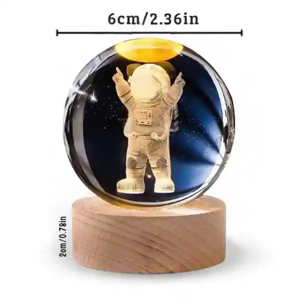 Dale un toque mágico y futurista a cualquier espacio con esta elegante lámpara decorativa de esfera de cristal 3D con diseño de astronauta. El grabado tridimensional en el interior de la esfera crea un efecto visual impresionante que, al encender la base LED, ilumina la figura del astronauta con una luz cálida y relajante. Su base de madera natural aporta un estilo moderno y decorativo que combina perfectamente con dormitorios, salas, escritorios o habitaciones infantiles. Es ideal como lámpara ambiental, decoración temática del espacio o regalo especial para amantes de la astronomía. CARACTERÍSTICAS Diseño 3D de astronauta dentro de esfera de cristal Iluminación LED cálida Base de madera decorativa Alimentación mediante cable USB Luz ambiental suave y relajante Ideal para decoración de dormitorio, oficina o sala MEDIDAS Diámetro de la esfera: 6 cm Altura de la base: 2 cm Altura total aproximada: 8 cm INCLUYE 1 Esfera de cristal grabada en 3D 1 Base de madera con luz LED 1 Cable USB de alimentación