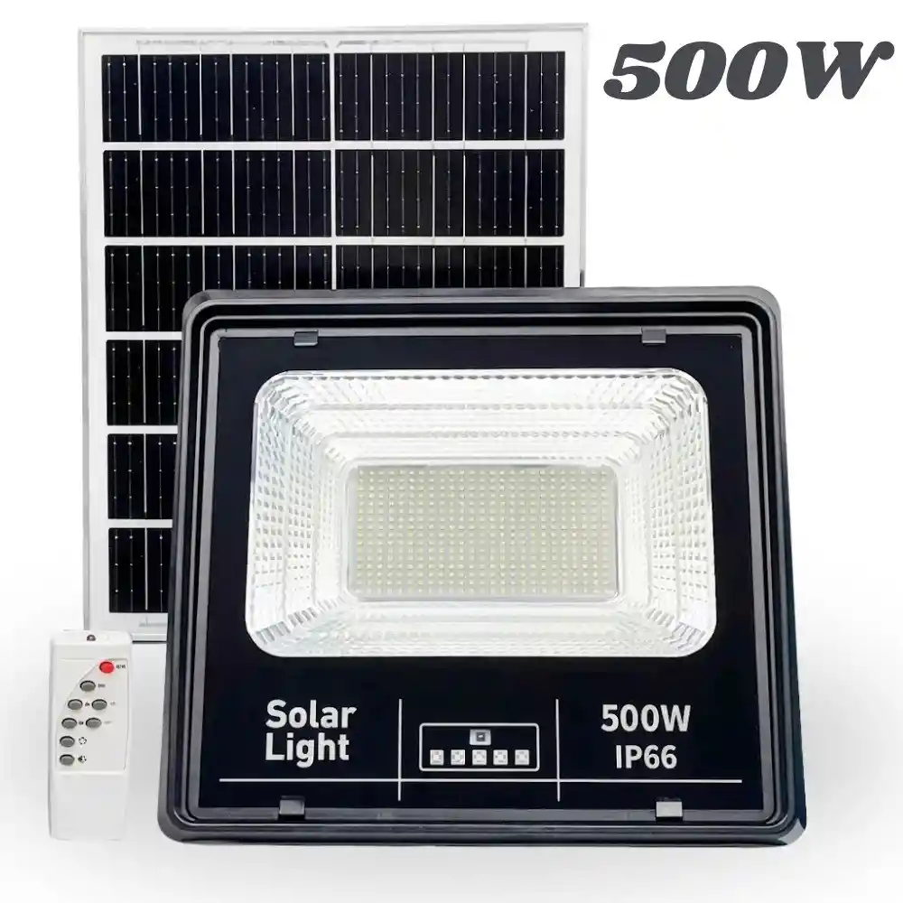 Lampara Solar Reflector Con Panel Solar Para Exterior 500W Esta es una solución de iluminación ecológica y eficiente, diseñada para iluminar exteriores sin depender de la red eléctrica. Esta lámpara cuenta con un potente reflector de 500W, ideal para áreas grandes o espacios que requieren una iluminación intensa, como jardines, patios, entradas, áreas de estacionamiento o caminos. - Equipado con un panel solar de alta eficiencia, esta lámpara convierte la energía solar en electricidad para alimentar el reflector. El panel solar, ubicado de forma separada y ajustable es ideal para optimizar la exposición al sol, capturando la luz durante el día y la convierte en energía almacenada en una batería interna. Esta batería alimenta la lámpara durante la noche o en días nublados. El diseño del reflector permite una gran cobertura de iluminación, con un haz de luz intenso. Además, la lámpara es resistente a las inclemencias del tiempo, con materiales duraderos y protección IP66, lo que la hace ideal para su uso en exteriores, resistiendo la lluvia, el polvo.