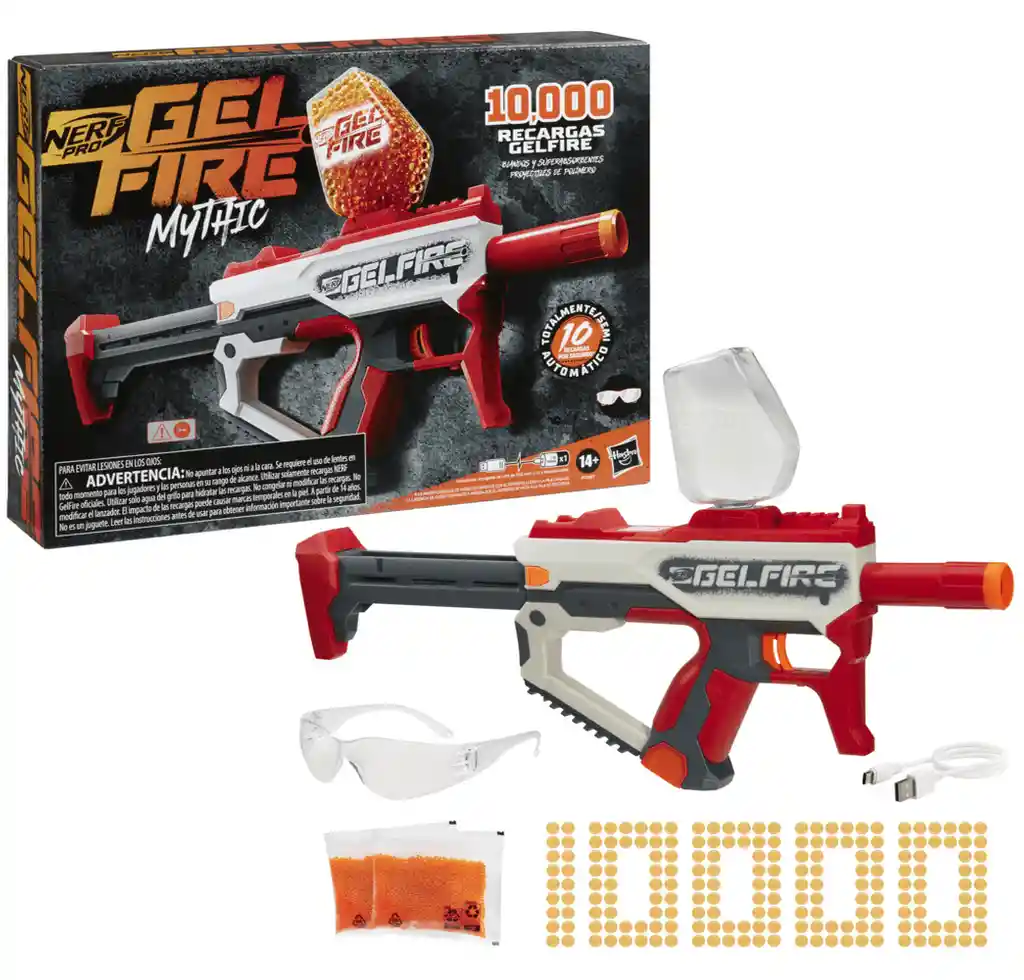 ¡Únete a la batalla con los lanzadores Nerf Pro Gelfire, los cuales usan recargas hidratadas que se separan al impactar! Estos lanzadores de gran capacidad son muy precisos para que lleves la ventaja frente a la competencia. La caja incluye una enorme cantidad de recargas Nerf Pro Gelfire deshidratadas para que tengas una gran cantidad de estas. Añade agua a las recargas para hidratarlas y poder usarlas. Las recargas hidratadas salen a una gran velocidad y se separan al impactar el objetivo. ¡No es necesario recoger las recargas! El lanzador automático Nerf Pro Gelfire Mythic incluye un depósito de gran capacidad para 800 recargas y 10 000 proyectiles Nerf Pro Gelfire de polímero deshidratados, blandos y superabsorbentes. El diseño innovador del lanzador combina estilo y calidad excepcionales. Cuenta con los modos automático y semiautomático, cañón removible, culata extensible, lentes de protección, pila recargable fácil de cambiar y cable de carga universal USB-A a USB-C. Requiere de un cargador de pared con puerto USB-A (no incluido). Se recomienda el uso al aire libre. A partir de 14 años. 10 000 RECARGAS NERF PRO GELFIRE HIDRATADAS: Añade agua a los blandos y superabsorbentes proyectiles de polímero para hidratarlos. Lanzan a alta velocidad y se separan al impactar el objetivo. No es necesario recoger las recargas LANZADOR AUTOMÁTICO NERF PRO GELFIRE MYTHIC: Cuenta con los modos automático y semiautomático, un depósito de gran capacidad y de cambio rápido para 800 recargas, y una pila recargable removible que se cambia fácilmente LANZA HASTA 10 RECARGAS POR SEGUNDO*: Elige entre los modos automático y semiautomático y lanza hasta 10 recargas por segundo para una cadencia de fuego extrema y continua en tus juegos al aire libre Fabricante: Hasbro Importador: Hasbro Colombia Recomendaciones: Requiere de la supervisión directa de un adulto, puede contener partes pequeñas, riesgo de asfixia o ahogamiento, no destinar este juguete para menores por debajo de la edad establecida en la etiqueta. Edad mínima sugerida: 14 años Lote: Dato variable. Se puede verificar en el sticker que trae el producto físico. Fecha de fabricación: Dato variable. Se puede verificar en el sticker que trae el producto físico.
