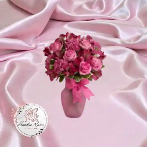 Un hermoso contraste de flores en tonos fucsia y rosa suave contiene 1 jarrón con rosas lilas y astromelias rosada con clavel. mas nota personalizada escribirla en el chat ideal para Cumpleaños, Día de la Madre ,Celebraciones especiales.
