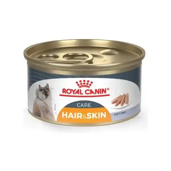 Royal Canin Hair & Skin Care en lata (85 g) es un alimento húmedo para gatos adultos que mejora la salud de la piel y el brillo del pelaje gracias a su contenido en ácidos grasos omega 3 y 6, biotina, zinc y vitaminas del grupo B. Su fórmula completa y equilibrada nutre desde el interior, ayudando a mantener un pelaje suave y saludable.