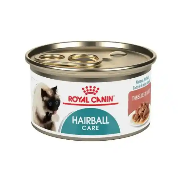 Royal Canin Hairball Care en lata (85 g) es un alimento húmedo para gatos adultos que ayuda a reducir la formación de bolas de pelo gracias a su contenido en fibras como el psyllium, que favorecen el tránsito intestinal. Con proteínas de calidad, baja grasa y alta humedad, mejora la digestión y contribuye al bienestar general del gato.