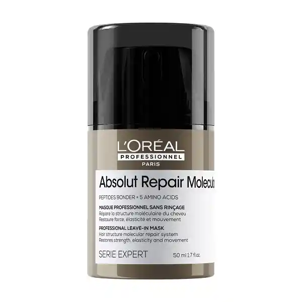Mascarilla profesional leave- in sin aclarado, formulada con Péptidess bonder + 5 Aminoácidos para reparar la estructura macromolecular del cabello. La textura ligera de la fórmula penetra al instante y restaura la fuerza. Aportando La elasticidad y el movimiento. Logrando un cabello suave y brillante con un aspecto sano y protegido frente a las agresiones externas Cuando el cabello se daña, su estructura molecular, compuesta de péptidos, se ve comprometida. Pero la mayoría de los péptidos son demasiado grandes para ser reinyectados en la fibra, lo que hace que el daño sea casi irreversible. Descubrimiento científico - Absolut Repair Molecular. Repara 2 años de daños en un solo uso*.