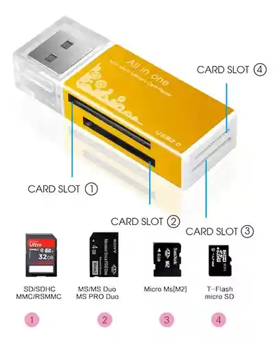 Lector de tarjetas 4 en 1 -Lee tarjetas SD, MicroSD, MS Dúo y M2 -Compatible con Windows, Mac OS, Linux y Android -USB 2.0 -No necesita controladores -Plug and Play -Admite tarjetas: *SDXC, SDHC, MMC, RS-MMC, *Micro SDXC, Micro SD, Micro SDHC, *MS Dúo, MS DUO Pro, M2.