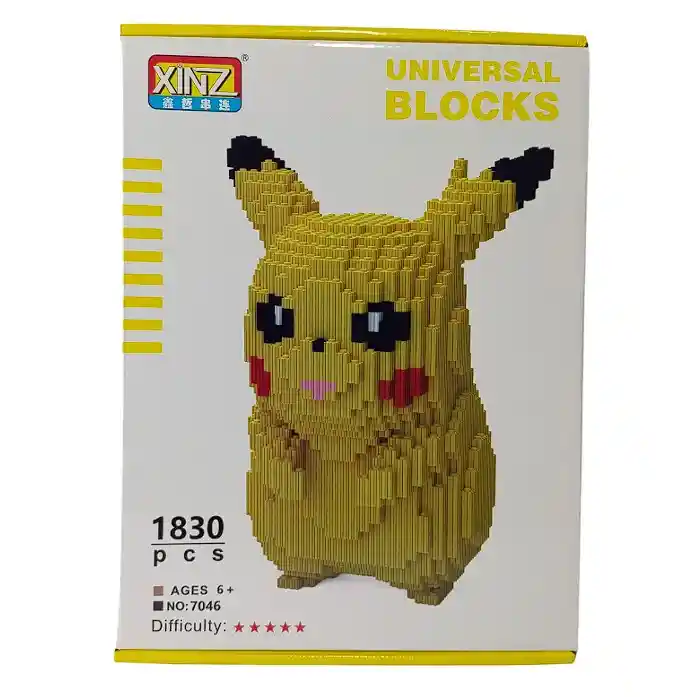 Figura armable tipo LEGO de Pikachu, con piezas detalladas y un acabado increíble. ¡Ideal para fans y coleccionistas!. Medidas: 28 x 18x 10 cm