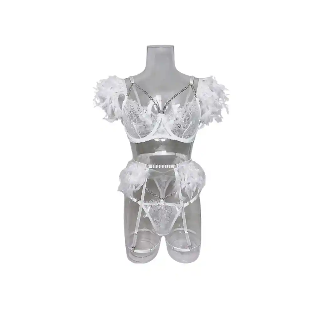 Lencería Blanca con Encaje y Plumas – Set de 3 Piezas Este hermoso set de lencería en color blanco combina delicadeza, sensualidad y un diseño angelical que roba miradas. Incluye brassier, panty y liguero con tiras ajustables para un fit perfecto y cómodo. El brassier está elaborado en encaje floral transparente, con detalles de cadenas plateadas que aportan un toque moderno y atrevido. La parte inferior y el liguero incorporan plumas suaves que crean un efecto glamuroso y femenino, ideal para ocasiones especiales. Las tiras ajustables permiten moldear la prenda al cuerpo, resaltando la cintura, las caderas y la silueta de manera favorecedora. Perfecto para noches románticas, sesiones de fotos o regalos especiales. Talla s