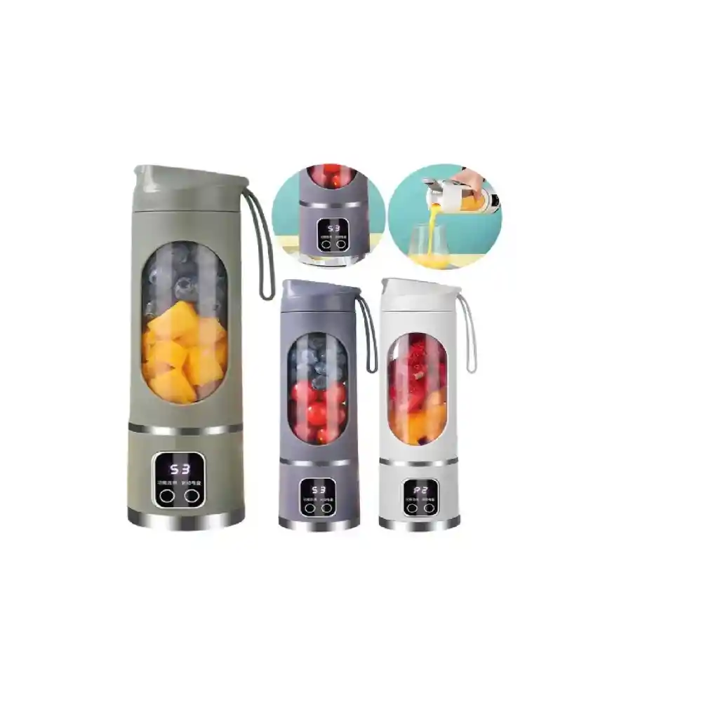 Licuadora eléctrica portátil de 450ml, máquina exprimidora inalámbrica recargable por USB Característica: -Esta mini licuadora tiene potentes capacidades de trabajo. Hay un mango de silicona en la licuadora para facilitar su transporte. Puede ponerlo en una bolsa de viaje para ahorrar espacio, lo que le permite beber jugo fresco en cualquier momento y en cualquier lugar. -La capacidad de 450ML es la adecuada: un vaso de zumo complementa la potencia del cuerpo, elija la fruta que desea exprimir, corte la fruta en trozos, póngala en la taza, y exprímalo para beber. -Carga USB: La taza del exprimidor USB está equipada con una batería recargable de alta calidad de 1500mAh y un cable de carga, que se puede cargar mediante una variedad de métodos como energía móvil, adaptador de corriente 5v a 1 Amperio, y ordenador. -12 cuchillas: mezcla fina, baja resistencia al batido, alto torque, corte rápido y delicado, uniformes, ideal para ingredientes delicados para batir. -Multifunción: La mini licuadora es muy adecuada para hacer batidos nutritivos de una sola porción, mezclas de jugos, frutas y verduras, café, batidos de proteínas, leche en polvo y suplementos alimenticios para bebés. Adecuado para cualquier cocina (uso personal no doméstico), oficina o exterior. Especificación: Modelo del producto: Peso del producto: 530 gramos Voltaje de carga: uso con adaptador 5v a 1 amperio (no incluye adaptador) Velocidad del motor: 12000 rpm Función: Tres velocidades ajustables, pantalla de carga, pantalla de nivel de batería Capacidad del cuerpo de la taza: 450ML Especificación de la cuchilla: 12 cuchillas de trituración rápida Material de la hoja: SUS304 Recomendaciones de uso: Paso 1 Corte la pulpa de la fruta en trozos pequeños y agréguela en la posición indicada por la flecha en el cuerpo de la taza. No exceda la flecha, de lo contrario la máquina no funcionará correctamente. Paso 2 A continuación, vierta agua en la posición designada en el cuerpo de la taza indicada por la flecha, asegurándose de que el agua no supere la flecha, de lo contrario, la máquina no podrá funcionar correctamente. Antes de poner en marcha, invierta la máquina para evitar que la pulpa se atasque y la cuchilla se desactive. Después de ponerla en marcha, agítela hacia atrás a unos 45 grados para que la pulpa quede más triturada en el menor tiempo posible.