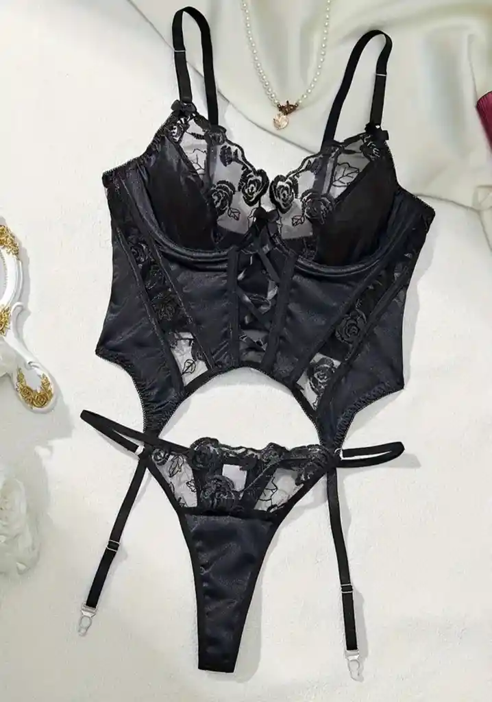 Talla 34/36 ✨Set de lencería de 3 piezas elaborado en licra destellante negra combinada con encaje floral bordado en forma de rosas. El diseño del bustier enmarcala cintura con un toque clásico y seductor, con varillas que brindan estructura y define la silueta sin copas prehormadas ni almohadillas, este conjunto que mezcla brillo, transparencias y elegancia en cada costura. El liguero incluye ligas.