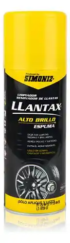 SIMONIZ LLANTAX Espuma – Limpiador y Renovador de Llantas (250 ml) SIMONIZ LLANTAX Espuma es un limpiador y renovador de llantas en espuma diseñado para limpiar, proteger y devolver el brillo a llantas de caucho y neumáticos. Su fórmula especial elimina polvo y suciedad adherida, dejando un acabado negro intenso y brillante. Ayuda a prevenir el agrietamiento y el desgaste prematuro del caucho, prolongando la vida útil de las llantas. Su aplicación es práctica y rápida: aplique y listo, sin necesidad de frotar.