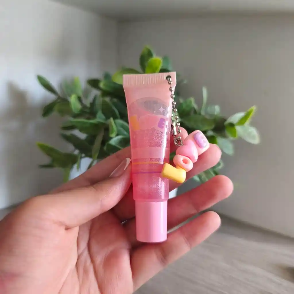 Este es un brillo labial (lip gloss) de la marca Jollylady, caracterizado por su diseño tierno que incluye un llavero. El producto combina maquillaje con un accesorio decorativo tipo charm, ideal para colgar en bolsos o llaves, y tiene un acabado con destellos brillantes para hidratar y dar luz a los labios.