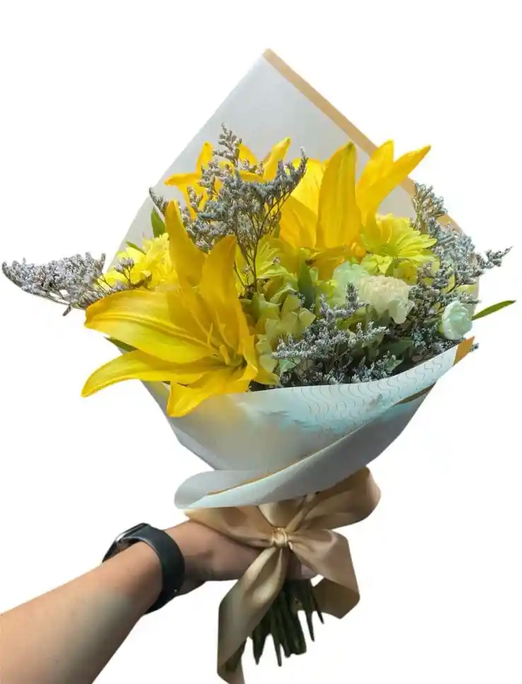 Hermoso ramillete compuesto por lirios amarillos, caspia, clavellina y margaritas, creando una combinación fresca y luminosa. Un detalle alegre y delicado, ideal para transmitir felicidad, gratitud y energía positiva en cualquier ocasión especial.