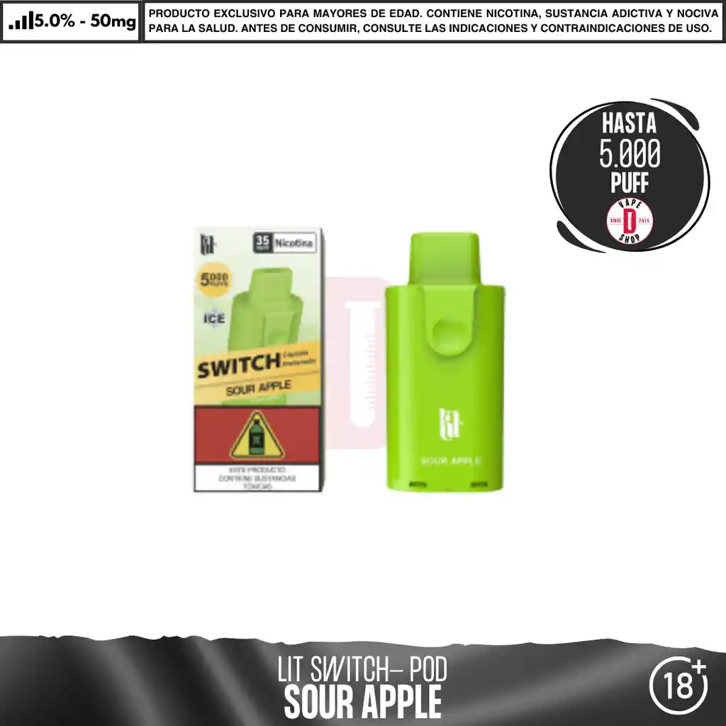 Lit Vapes - Litpod Switch Pod 5000 PUFF La CÁPSULA SWITCH Prellenada es la forma más práctica y potente de disfrutar tu vape. Diseñada para usarse con el KIT SWITCH, cada cápsula viene lista con 35mg de nicotina y ofrece hasta 5000 puffs de sabor intenso y consistente. Gracias a su tecnología Mesh Coil, la cápsula realza los sabores y produce un vapor suave y uniforme en cada inhalada. Además, cuenta con efecto ICE refrescante, perfecto para quienes buscan una experiencia fresca y duradera. Sabores disponibles de la Cápsula SWITCH: Strawberry Watermelon – Fresa sandia. Frozen Blueberry – arándano helado. Frozen Mint – menta helada. Grape Soda – gaseosa de uva. Sour Apple – manzana verde ácida. Mango Passionfruit – =combinación tropical de mango y maracuyá. Características principales de la cápsula SWITCH: Hasta 5000 inhaladas por cápsula. Pod prellenado con nicotina (35mg). Compatible con el KIT SWITCH. Tecnología Mesh Coil para mejor sabor. Diseño práctico, seguro y desechable. Con la CÁPSULA SWITCH, olvídate de recargas y disfruta de tus sabores favoritos con la máxima comodidad. Precio Unitario Ingredientes: Glicerina Vegetal (USP), Propilenglicol (USP), Nicotina (USP), Extractos de sabor de grado alimenticio. Advertencia: Contiene nicotina, que puede ser venenoso. Evitar el contacto con la piel y los ojos. No ingerir. Mantener siempre en empaque original y en un ambiente fresco y seco. Mantener alejado de niños y mascotas. No debe utilizarse por Mujeres en estado de embarazo o personas con problemas de respiración como el asma. En caso de accidente contacte a la línea 123. Producto para mayores de 18 años.