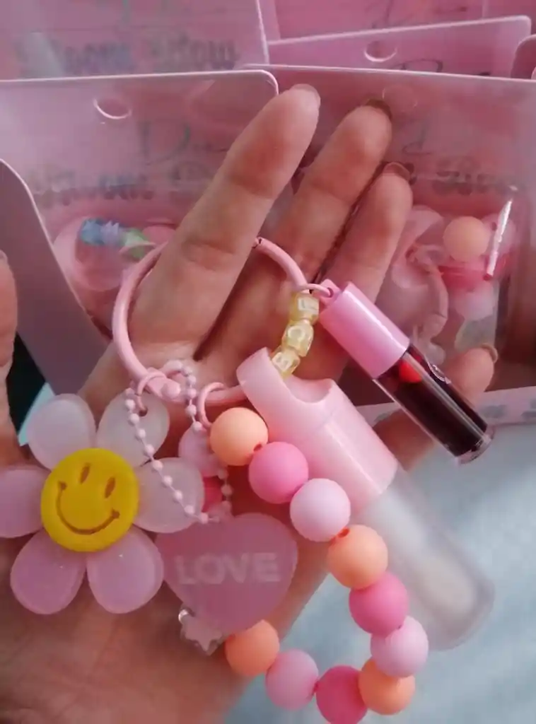 Llavero con charms, incluye un brillo labial Mimosa grande (hidratante no es pegachento)+ Mini tinta de alta pigmentacion y duracion un accesorio que toda Girl debe tener