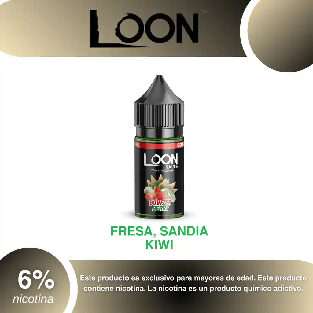 Loon Salt 30 ml, Sabor Fresa Sandia Kiwi 6% PROHIBIDA LA VENTA A MENORES DE EDAD. ADVERTENCIA: ESTE PRODUCTO CONTIENE NICOTINA, LA NICOTINA ES UNA SUSTANCIA QUIMICA ADICTIVA Y NOCIVA PARA LA SALUD. Los líquidos para vapeo contienen: propilenglicol USP, glicerina USP, sabor artificial y nicotina. Este producto puede contener nicotina, una sustancia altamente adictiva que puede generar dependencia, posibles afectaciones arteriales, cardiacas, pulmonares y otras aun no identificadas. No se recomienda su uso a mujeres en embarazo, puede generar lesiones al feto. Mantener alejado de niños y mascotas. No ingerir, puede generar irritación y/o intoxicación. Por favor antes de consumir consulte a su médico posibles afectaciones o sensibilidad a alguno de sus componentes. Los componentes de este producto pueden aumentar la sensación de ansiedad En caso de notar alguna reacción adversa por favor suspenda su uso de manera inmediata. Siga las instrucciones en el envase. No alterar sus componentes. Adquiera sus productos en sitios de confianza No use productos piratas, alterados, o en los cuales no pueda comprobar su buena procedencia, Verifique la reputación del fabricante y distribuidor antes de adquirir cualquier producto Si no es usuario fumador o vapeador no se recomienda su uso bajo ninguna circunstancia Al usar este producto usted es consciente que este producto puede generar afectaciones a su salud, incluyendo aquellas que a la fecha de la compra no se han identificado y que pueden aparecer a largo plazo.
