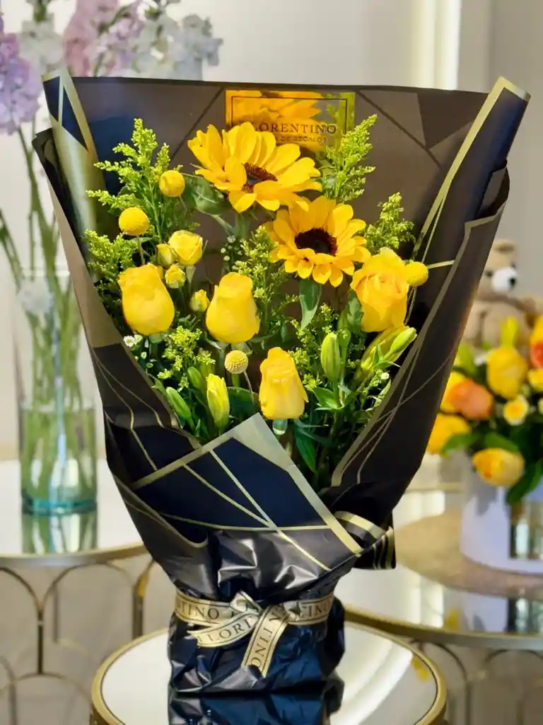 Una creación única que convierte cada elemento en una expresión de amor y propósito, perfecta para sorprender en ocasiones especiales y dejar huellas imborrables. DESCRIPCIÓN Una combinación vibrante de girasoles, rosas y verde de acompañamiento. Un diseño lleno de color y armonía, ideal para expresar optimismo, gratitud y alegría en cualquier ocasión especial. Cada flor es dispuesta a mano en un diseño sofisticado que transmite serenidad, admiración y elegancia. INCLUYE - Tarjeta personalizada sin costo adicional.