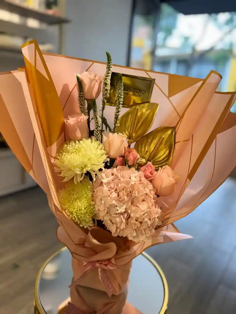 Una propuesta floral única que combina flores premium en un diseño artesanal que transmite frescura, romanticismo y elegancia. DESCRIPCIÓN Un delicado mix de flores premium que combina hortensias, rosas, mini rosas según disponibilidad. Cada elemento es dispuesto con cuidado en un diseño artesanal de lujo, pensado para transmitir frescura, romanticismo y distinción, perfecto para los momentos más especiales. INCLUYE - Tarjeta personalizada sin costo adicional.