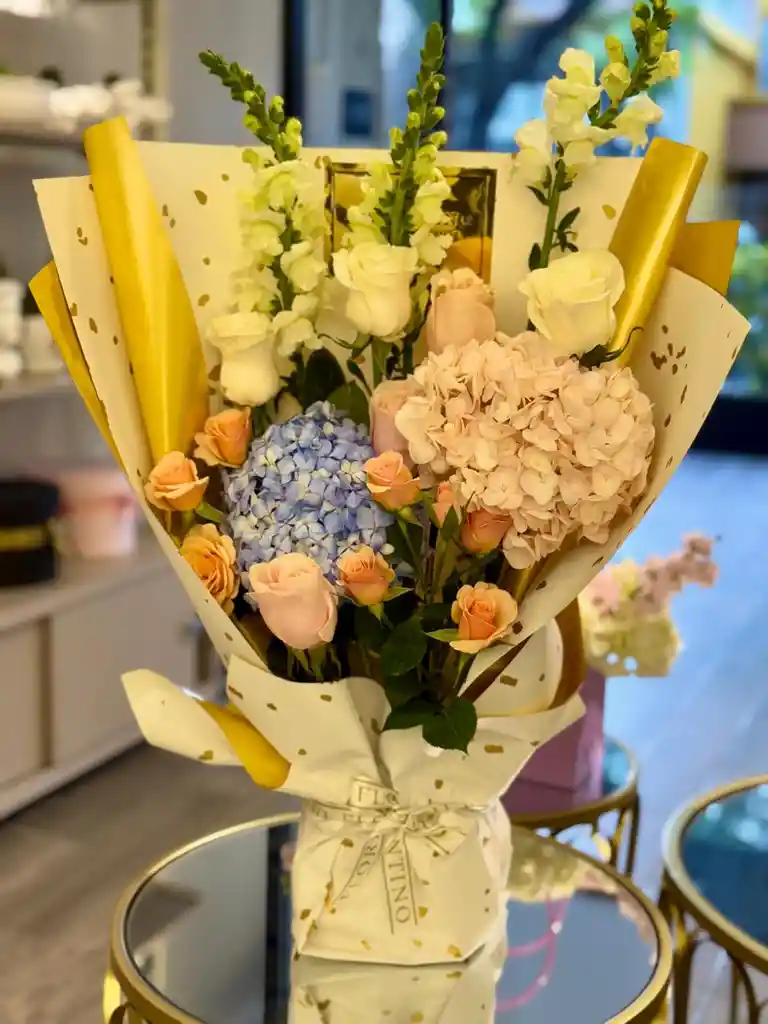 Una propuesta floral única que combina flores premium en un diseño artesanal que transmite frescura, romanticismo y elegancia. DESCRIPCIÓN Un delicado mix de flores premium que combina hortensias, rosas, mini rosas y snapdragon, según disponibilidad. Cada elemento es dispuesto con cuidado en un diseño artesanal de lujo, pensado para transmitir frescura, romanticismo y distinción, perfecto para los momentos más especiales. INCLUYE - Tarjeta personalizada sin costo adicional.