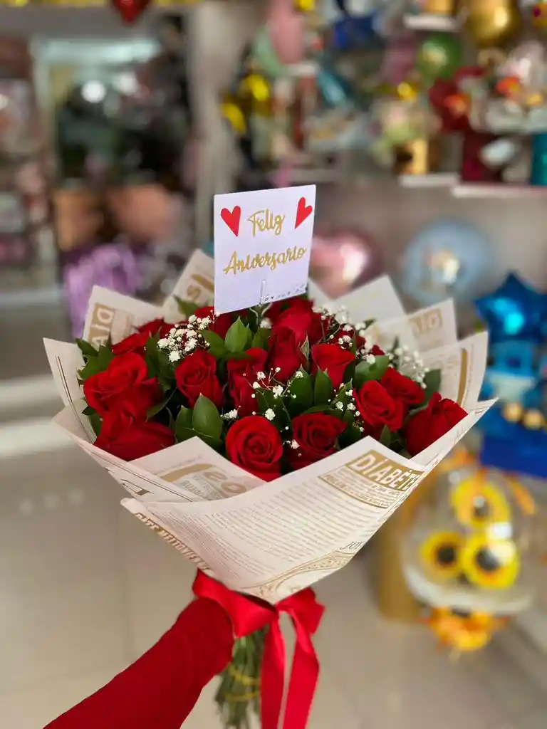 Bouquet floral de 24 rosas con follaje mixto, envoltura especial en papel coreano, tarjeta personalizada y 2 mariposas decorativas. * Las rosas pueden ser a elección del cliente y según disponibilidad* *El color de la envoltura según disponibilidad*