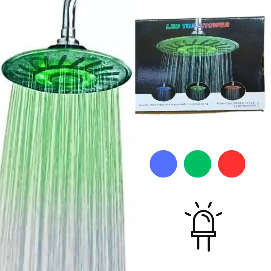Cabezal de ducha LED 20 cm color según temperatura Material: ABS Conexión: 1/2" Diámetro: 20 cm Luz azul: menos de 25 °C Luz verde: entre 26 °C y 35 °C Luz roja: entre 36 °C y 45 °C Luz roja intermitente: mas de 45 °C Enciende con la la fuerza del agua