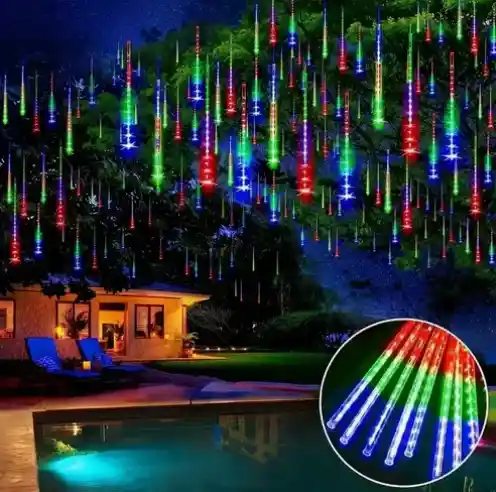 Luz Navidad Led blanco frio - Lluvia de Meteoritos 8 Tiras (cada tira tiene 50cm de caida) - Tiene 3 Metros de ancho + 80cm del cable del enchufe DIRECTO 220V - EXTERIOR IDEAL ARBOLES - TECHOS - NAVIDAD Luz de lluvia de meteoritos LED: luces de lluvia de meteoritos LED, la luz de cada led se enciende y apaga uno por uno en secuencia y rápidamente como lluvia de meteoritos o nieve que cae en el cielo nocturno, muy hermosa. Se puede utilizar como uno o conectarse (hasta 3 luces de lluvia que caen) Alta calidad y eficiencia energética: chips LED súper brillantes, las luces de tubo son impermeables IP65, a prueba de polvo, material de PC transparente, resistente a la corrosión, resistente a los costos, resistente al envejecimiento, más duradero, libre de limitaciones de tiempo y espacio. Bajo consumo de energía y ahorro de energía, si obtienes un juego con 8 tubos en cascada al mismo tiempo, simplemente conéctalo durante un cierto tiempo, se cascada al azar, porque cada tubo tiene un IC individual, cada tubo caerá al azar