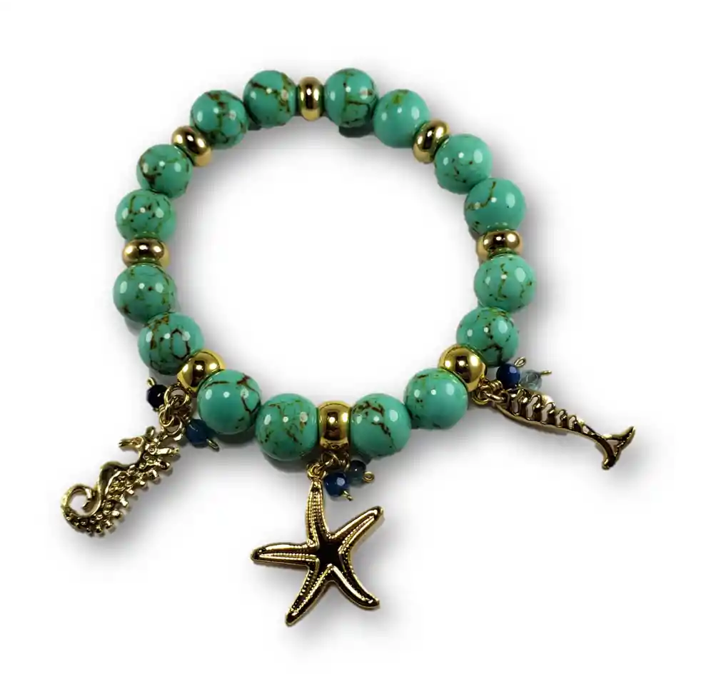 Así como únicas, cada pulsera cuenta una historia llena de sentimientos y buenos recuerdos. Dale un toque diferente a tu outfit para que la magia de nuestras pulseras perdure todo el día, pues las hemos creado llenas de significado y amor para inspirar y empoderar. Producto distribuido por Paralelos Accesorios Tipo de pulsera: Elástica Materiales -Gemas: Turquesa veteada -Dije: Aleación con baño en oro brillante -Elementos metálicos: bronce con baño en oro 18k Tamaño aproximado: 18 cm de diámetro Peso: 28 gramos - Garantía de 30 días en acabados bajo condiciones normales de uso. Cada pulsera integra diferentes elementos y materiales que merecen un cuidado especial. - Al ser una pieza ensamblada de forma artesanal el producto entregado puede presentar diferencias de colores y acabados al expuesto en la fotografía