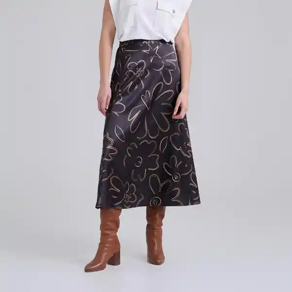 Falda negra en silueta tipo “A” con resorte en la pretina posterior y cremallera en el costado izquierdo. Tela estampada con nuestro print de la colección Florecer en el Camino. Composición: 94.5% poliéster, 5.5% spandex. La modelo mide 1,70 m y usa talla M. Cuidados especiales: Leer la etiqueta de cuidados antes de lavar. .