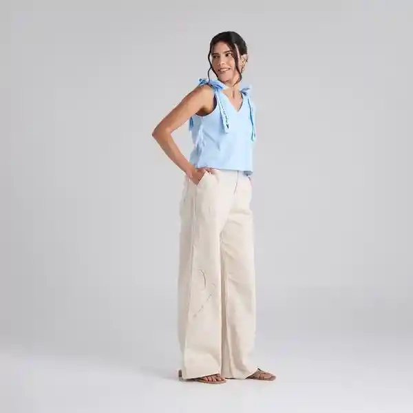 Top azul con escote en “V” en delantero y espalda. Tirantes largos ajustables con detalle bordado en los lazos. Composición: 97% algodón, 3% spandex. La modelo mide 1.60 m y usa talla S. Cuidados especiales: Leer la etiqueta de cuidados antes de lavar.