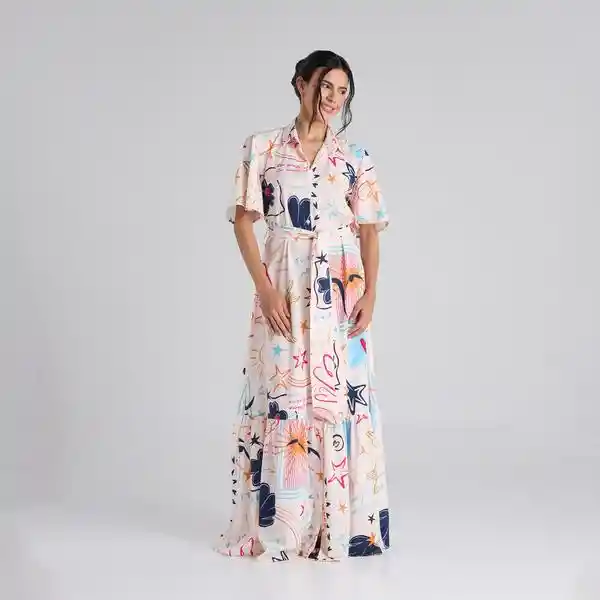 Vestido camisero marfil largo de cuello clásico y cierre frontal con botones. Manga corta, bolero en la parte inferior, dos pasadores en los costados y cinturón removible. Composición: 88.7% poliéster, 11.2% elastómero. La modelo mide 1.60 m y usa talla S. Cuidados especiales: Leer la etiqueta de cuidados antes de lavar.