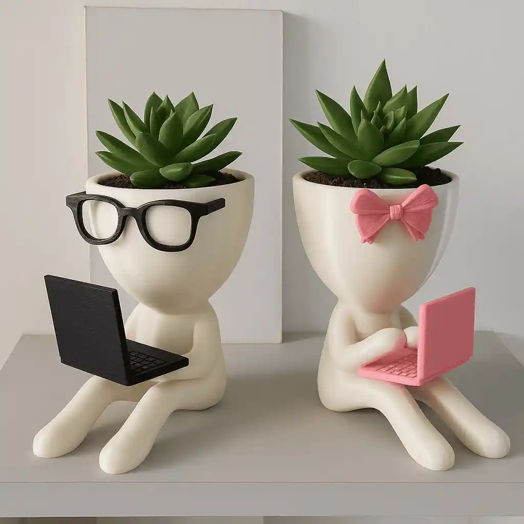 Maceta 3D “Oficinista Cute” – ¡Una ternura para tu hogar u oficina! 💕💻🌱 Dale vida a tu espacio con estas preciosas maceticas en 3D que parecen estar trabajando en su laptop. Son súper adorables, elegantes y perfectas para cualquier rincón de la casa. ✨ Modelos disponibles: 👓 Oficinista con gafas – laptop negra y pocillito 🎀 Chica con moño rosa – laptop rosada, delicada y femenina Son ideales para poner suculentas, cactus o esa plantica especial que quieres lucir. Quedan perfectas en: ✔ La sala ✔ La cocina ✔ La oficina ✔ El tocador ✔ La mesita de noche Están hechas en PLA ecológico, son livianas, resistentes y 100% decorativas. ¡Un detalle hermoso para regalar o consentirte! 💗 Le dan un toque dulce, moderno y muy coqueto a cualquier espacio. ¡Llévate la tuya y enamórate cada vez que la veas! 🌸🌿