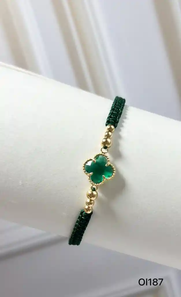Pulsera tejida en hilo terlenca con 4 balines de 3mm y 2 balines 4mm dije de trebol de 11 mm en oro laminado 18K. La Pulsera es ajustable hasta 24 cm de diámetro. Va empacada en Cajita para Obsequio. QUE ES EL ORO LAMINADO? Son piezas que se obtienen fundiendo TRES láminas gruesas de ORO de 18K, sobre una base especial de 2 metales: Tombac y Paladio; esta última asegura la adherencia, que junto a las láminas de ORO de 18K, forman un material antialérgico (libre de níquel), de alta resistencia garantizando la invariabilidad de su color en el tiempo y con el mismo tono, textura y brillo del ORO 18K. Todas nuestras joyas en oro laminado 18k tienen 1 años de garantía. -CUIDADOS ESPECIALES - Si la usas para hacer ejercicio, en la piscina o en el mar, simplemente debes lavarla con agua y jabón, y frotar suavemente con un cepillo de dientes de cerdas suaves; para que todos estos agentes corrosivos no afecten su brillo y la semi joya pueda perdurar en el tiempo. NO aplicar ácidos y evitar rayones o raspaduras. ATENCIÓN: LA JOYA NO ES EMPEÑABLE, NO ES ORO MACIZO- ASÍ QUE NO SE VENDE POR PESO NI GRAMOS. Somos giftsjoyas
