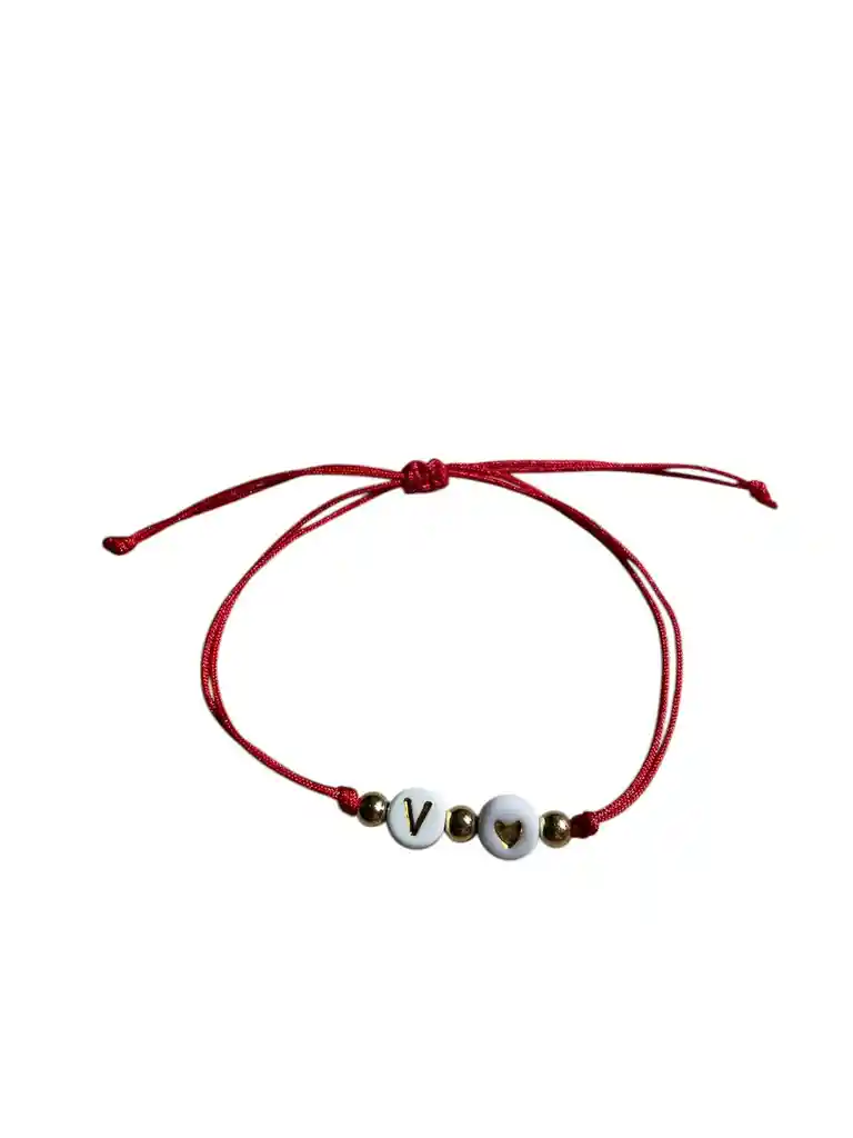 MANILLA HILO ROJO CON LETRA ACRILICA V+ CORAZON ACRILICO DORADO Composición: - hilo coreano celular rojo 0,8mm - separador acrílico blanco con letra/símbolo corazón dorado - 2 balines de baño de oro #4 mm Tamaño: 16 - 18cm