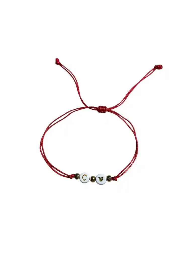MANILLA HILO ROJO CON LETRA ACRILICA C + CORAZON ACRILICO DORADO - hilo coreano celular rojo 0,8mm - separador acrílico blanco con letra/símbolo corazón dorado - 2 balines de baño de oro #4 mm Tamaño: 16 - 18cm