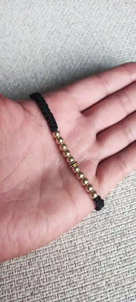 MANILLA NEGRA 10 BOLAS DE 5MM 1 SEPARADOR NEGRO ORO LAMINADO, TEJIDO A MANO EN MICROMACRAME Los beneficios del oro laminado como joya son: su menor costo comparado con el oro sólido, su apariencia idéntica al oro macizo, su mayor durabilidad frente al oro chapado, y su resistencia a la humedad, lo que lo hace una alternativa asequible y elegante para quienes buscan estilo sin gastar una fortuna.