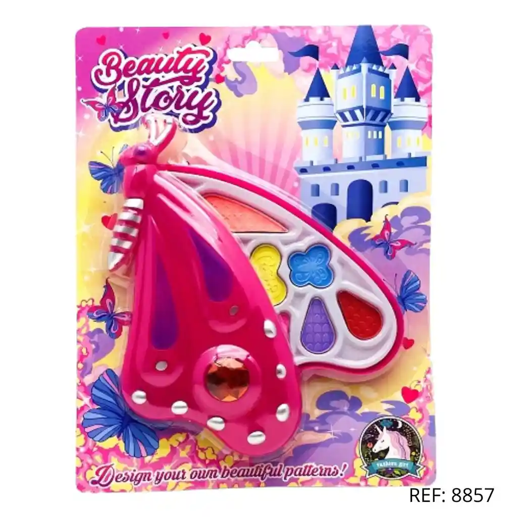Set de maquillaje infantil Beauty Story con diseño de mariposa. Incluye sombras y brillos labiales en un estuche compacto y seguro. Ideal para juego creativo y de imitación.