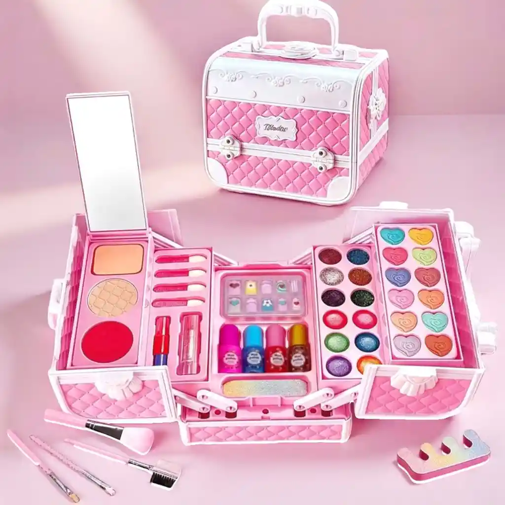 Set de maquillaje infantil lavable HERMOSO COFRE KIT FOR KIDS Este set contienen diferentes accesorios con los que los niños pueden jugar para mejorar su creatividad y sus habilidades estéticas. Es facil de limpiar. Este kit de maquillaje es el juguete perfecto, podran pasar muchas horas de diversión y se probarán varios maquillajes y estilos. Contiene : sombra de ojos en clider Sombras mate Aplicadores maquillaje esmalte de uñas Brillo labio Labial Lima uñas 10 Uñas postizas Cofre con espejo