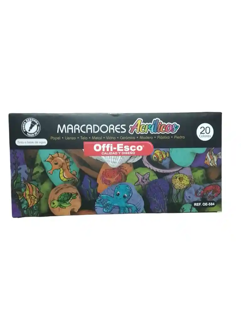 MARCADOR ACRÍLICO PUNTA REDONDA 2MM X20 OFFI-ESCO, 20 COLORES INTENSOS Y DE ALTA COBERTURA. IDEAL PARA MADERA, VIDRIO, PAPEL Y MANUALIDADES. TRAZO UNIFORME Y SECADO RÁPIDO.